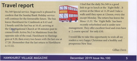 Now into the third year since restoration of the Sunday 349 service, passenger numbers are holding up northbound and southbound with regular users and on two occasions in October and November groups of hikers boarded at Hastings for Bodiam comprising 17 and 27 members respectively. This – and other matters – were discussed at the Hawkhurst Transport Accessibility Group at their AGM and Christmas dinner at the Queen’s Inn, Hawkhurst in early December. This service is reliable and the drivers know their routes well. Unfortunately, the Arriva 5 service has featured breakdowns during the week on its double deckers serving the Sandhurst – Maidstone route. This was reported to Kent County Council officer who attended the meeting. One member suggested that a link to Sissinghurst National Trust castle/gardens should be restored to offer an alternative to the car, and access for all.There are 200,000 visitors a year to this beautiful property. Hawkhurst Village Magazine carried this piece from member Gillian Davis: